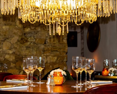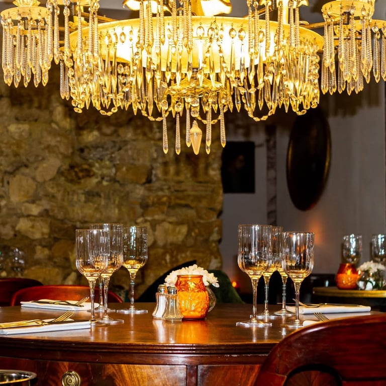 À l’intérieur, le salon de thé avec cheminée offre un contraste feutré. Mur en bois, miroirs d’époque, tableaux, velours patiné sous les lustres distillant une lumière tamisée : tout y invite à la conversation posée, aux confidences autour d’un verre ou d’un café gourmand. L’hiver, le feu crépite dans l’âtre, réchauffant l’atmosphère avec une élégance discrète.