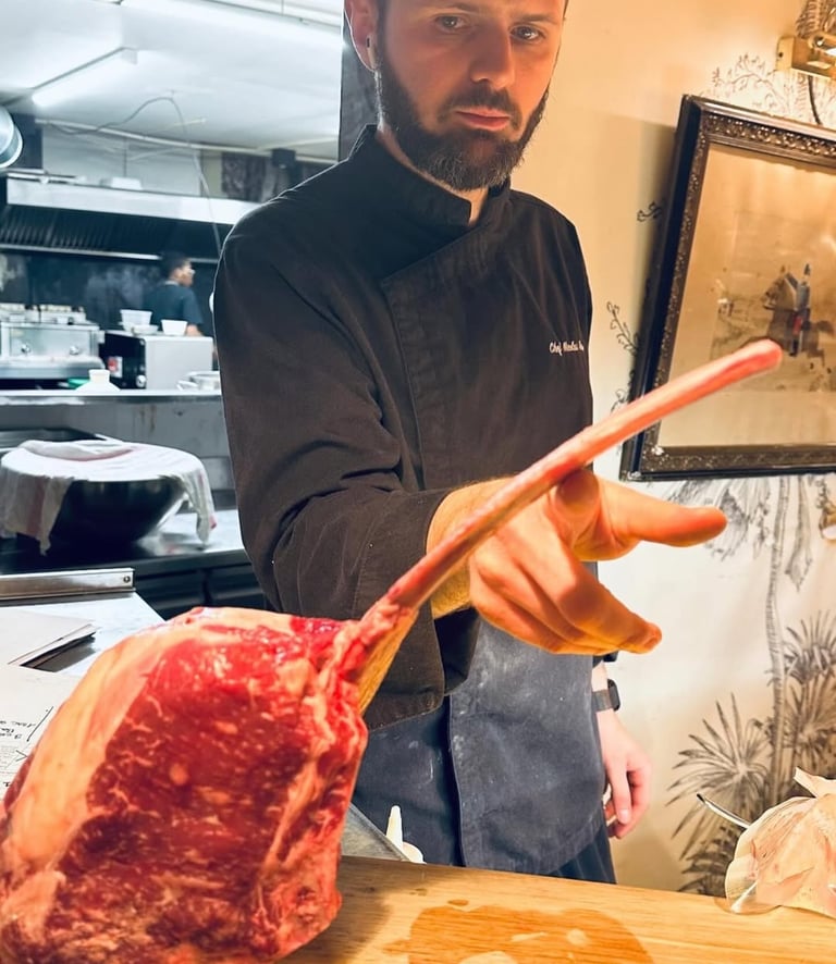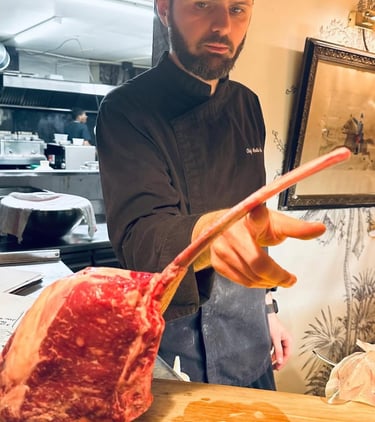 Parmi les incontournables : nos pâtes flambées dans la meule de parmesan directement en salle, le tartare de bœuf monté sous vos yeux, ou encore notre sôle meunière, découpé devant vous. En parralèle, l’ardoise met en valeur chaque jour des produits de saison : poêlée de calamars, pata negra, risotto de homard, filet de bœuf charolais...