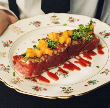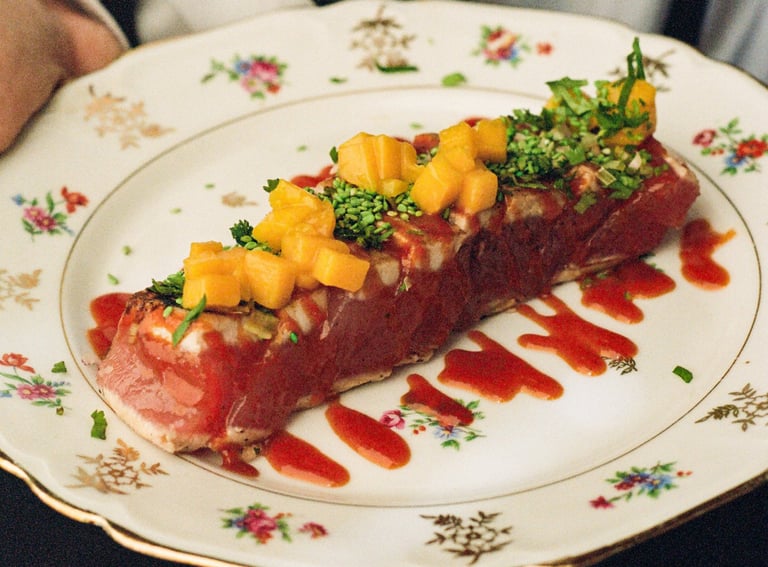 Belle pièce de bœuf marinée juste saisie, soja, coriandre, citronnelle & vinaigrette